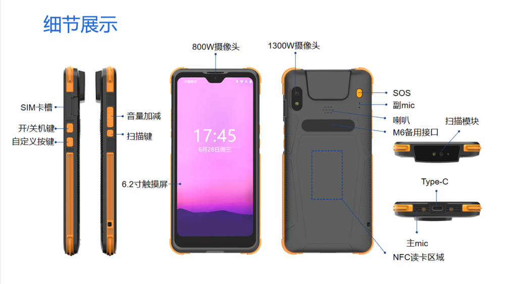接口:耳機:TYPE-C耳機;USB:TYPE-C接口(USB 2.0,支持OTG);外掛M6接口:外掛座充、串口等;串口:2個串口 (掃描+M6接口)
